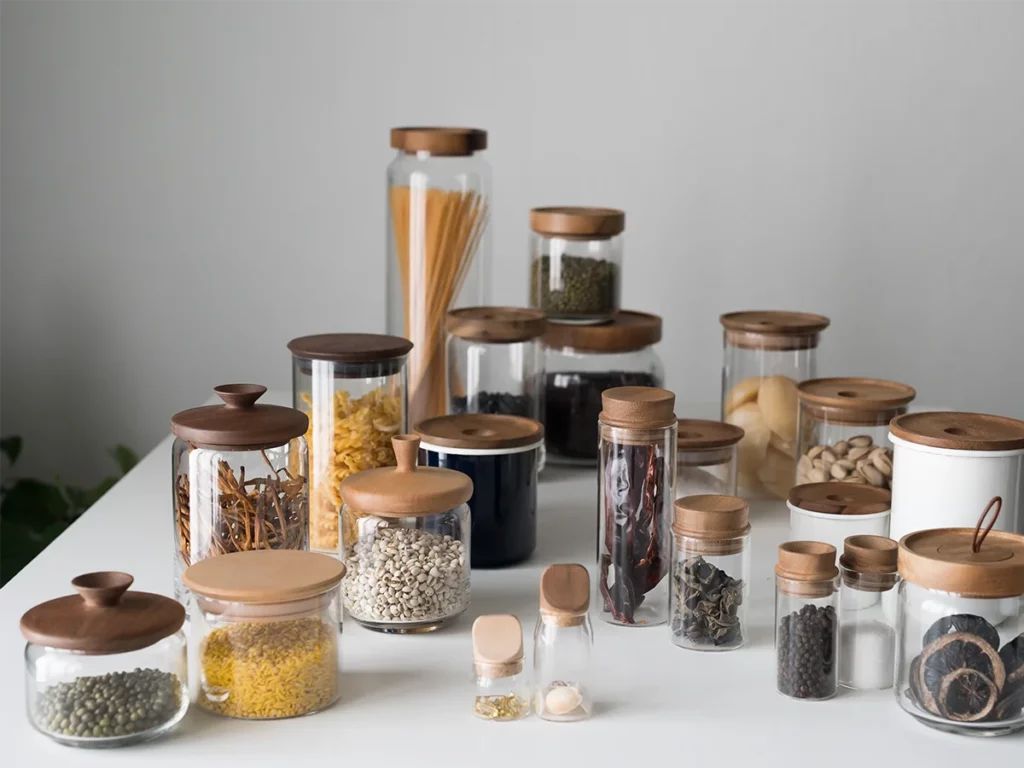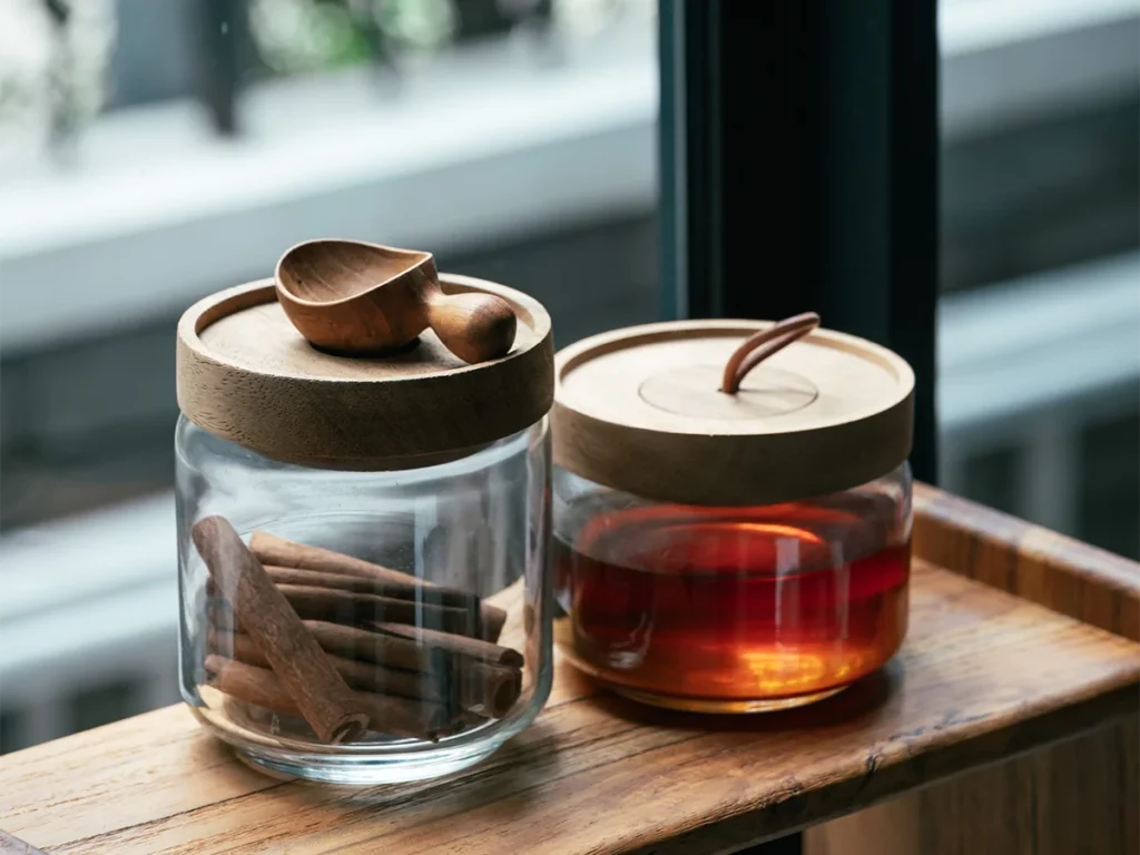 私たちのキャニスターの最大の魅力は、クリアなガラスと、温かみのある天然木の蓋が織りなす完璧な調和にあります 。蓋に使用されているのは、職人が一点ずつ丁寧に削り出した無垢の木材です 。大量生産品にはない、指先にしっとりと馴染む滑らかな曲線や、一点ごとに異なる豊かな木目は、使う人の心に心地よい安らぎを与えてくれます。