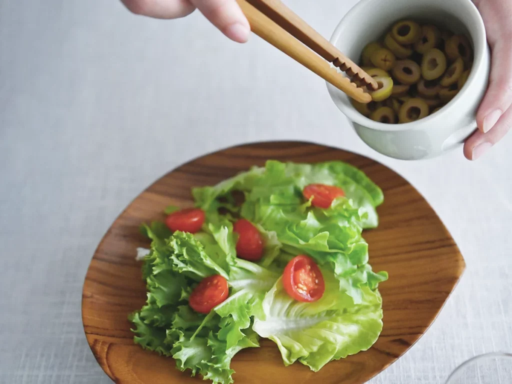 サラダを木のプレートに盛り付ける。