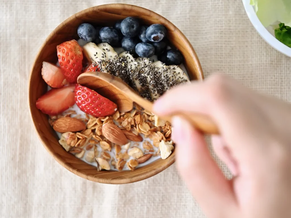 ヨーグルトにフルーツやグラノーラを添えて、木のスプーンで混ぜる。